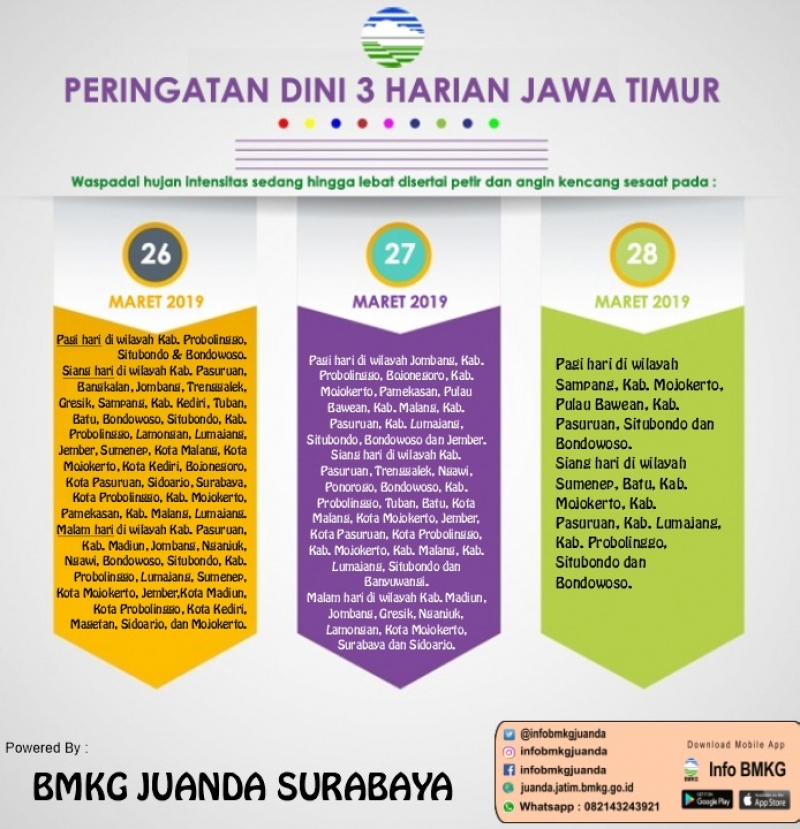 Surabaya,cakarawalanews.co – Badan Meteorologi Klimatologi dan Geofisika (BMKG) Klas I Juanda mengimbau pada masyarakat agar mewaspadai hujan dengan intensitas sedang hingga lebat yang disertai petir dan angin kencang. Hujan ini akan berlangsung sesaat terutama diprediksi terjadi di wilayah Kabupaten Probolinggo, Situbondo, dan Bondowoso.