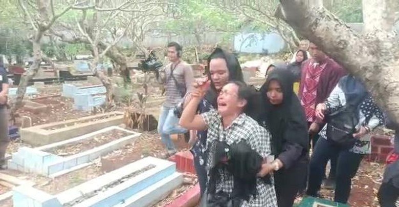 Rosminah yang terus menangis tiba-tiba tak kuasa menahan tubuhnya hingga tersungkur di antara makam-makam. Sejumlah anggota keluarganya pun kaget dan langsung membopongnya.