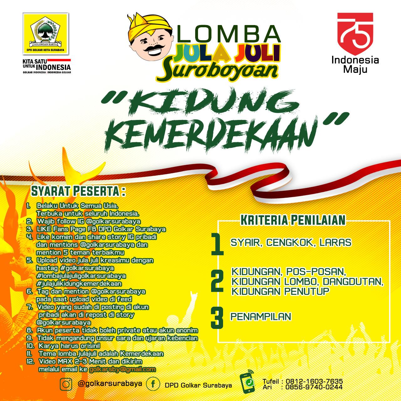 Surabaya, cakrawalanews.co – Turut ikut melestarikan budaya DPD Partai Golkar Kota Surabaya menggelar lomba Jula Juli Suroboyoan dengan tema kemerdekaan dalam rangka memperingati HUT ke-75 Kemerdekaan RI Tahun 2020.