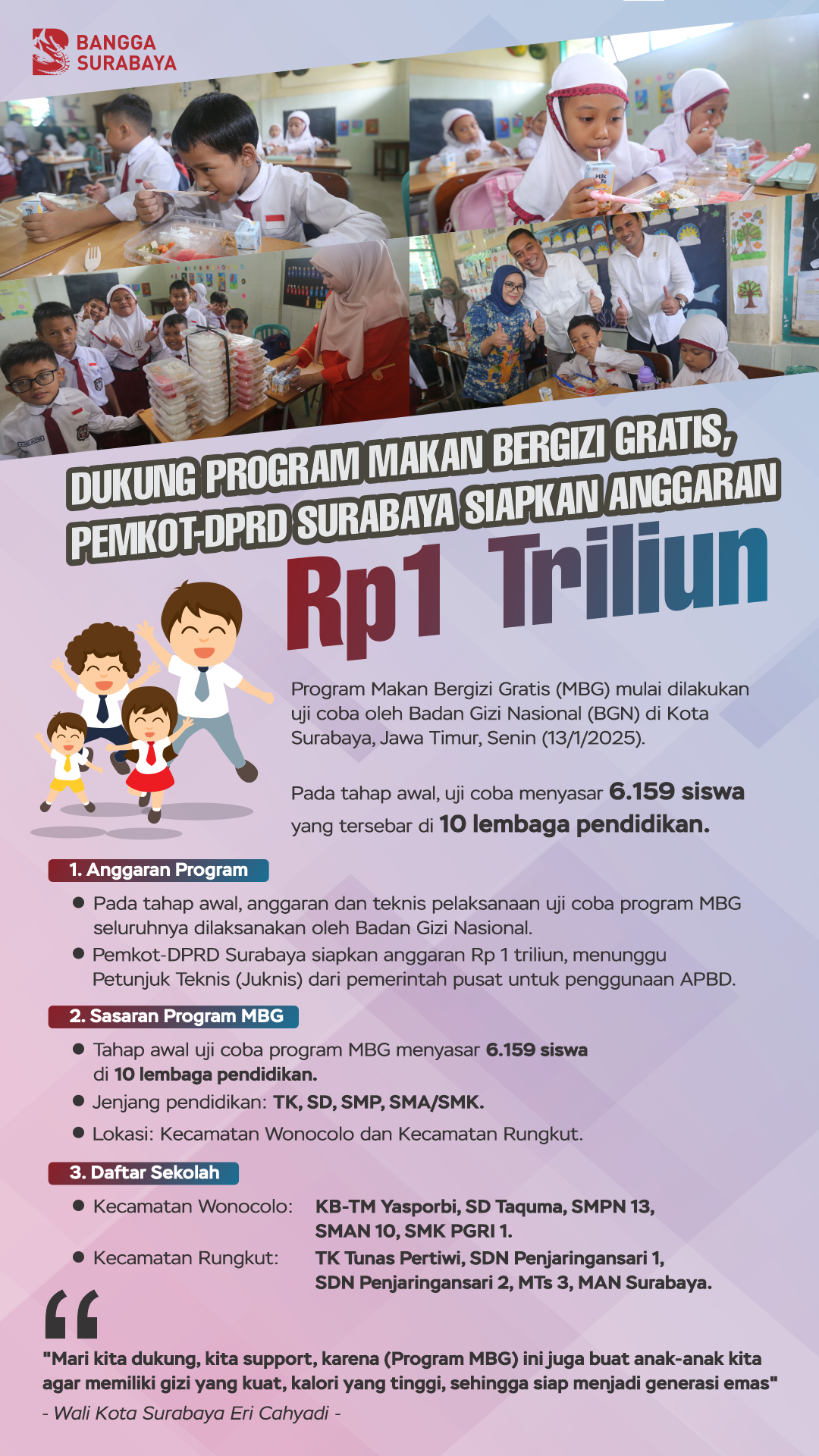 Di samping itu, ia juga memastikan pelaksanaan MBG di Surabaya tidak akan mengganggu jam belajar siswa. Sebab, pelaksanaan program ini telah disesuaikan berdasarkan jenjang pendidikan siswa. “PAUD agak pagi karena jam masuknya pagi dan pulangnya lebih cepat. Kemudian SD menyesuaikan, sekitar pukul 09.00 WIB dan SMP agak siang. Dengan pola itu semoga semua bisa tepat waktu dan terfasilitasi,” tandasnya.