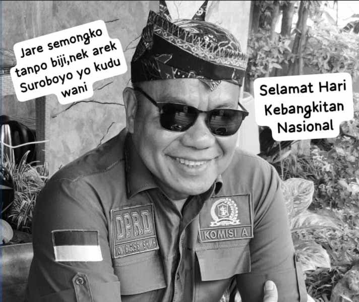 “Jare semongko tanpo biji, nek arek Suroboyo yo kudu wani!” tulis Cak YeBe dalam unggahan fotonya, Selasa (20/5/2025), lengkap dengan seragam Komisi A, bendera Merah Putih, dan ikat kepala khas Suroboyoan.