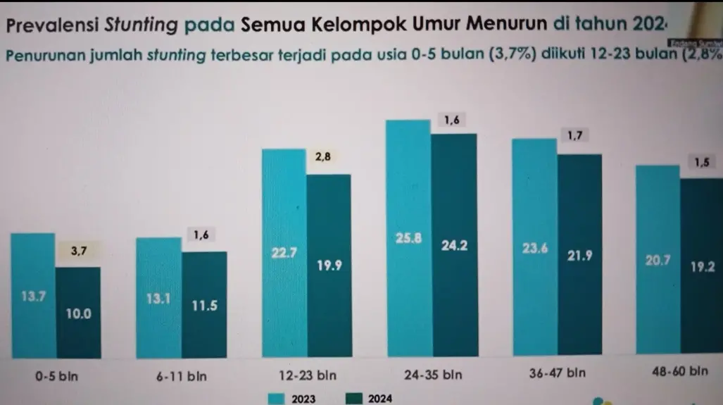 Penurunan stunting yang signifikan terlihat pada balita usia 0–5 bulan (turun 3,7% menjadi 10%) dan 12–23 bulan (turun dari 22,7% menjadi 19,9%).